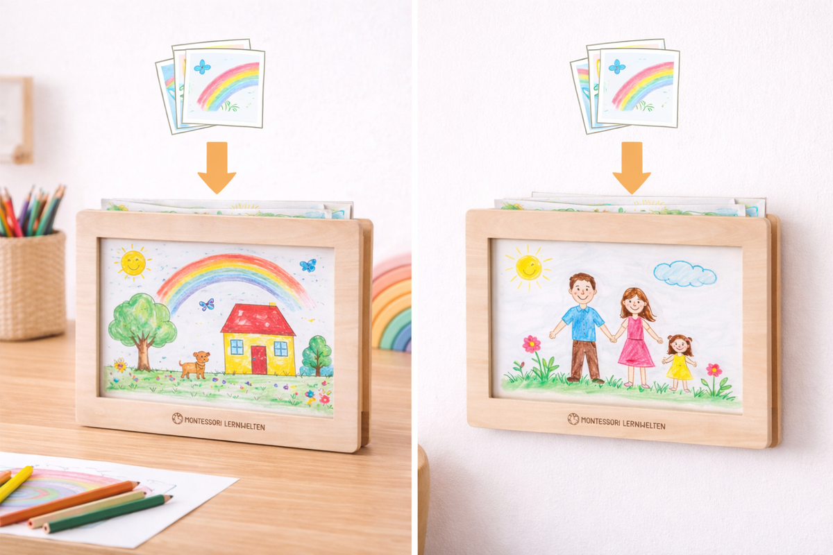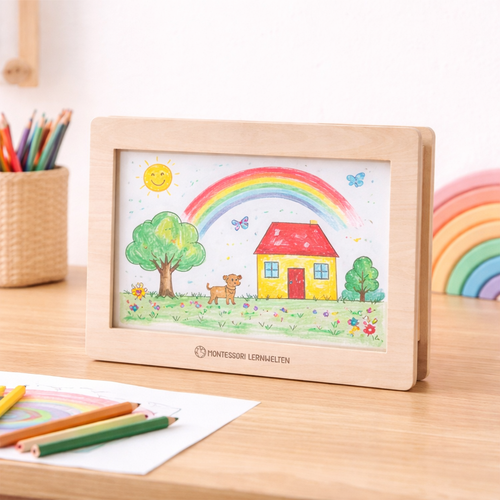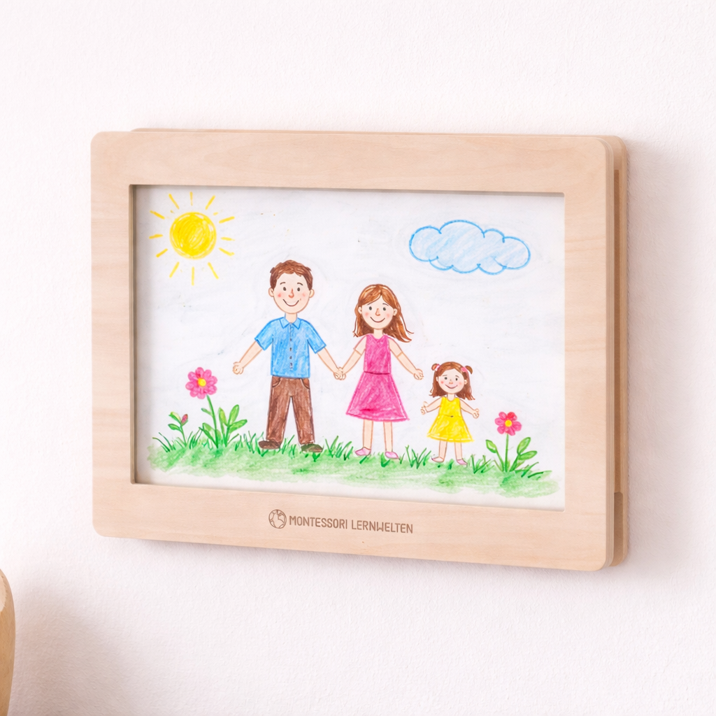 Questa cornice nasconde un piccolo segreto. Non solo mette in mostra l'ultimo dipinto di tuo figlio, ma è anche una piccola raccolta d'arte in cui conservare diverse immagini: ad esempio, i bambini si divertono a cambiare ogni settimana le loro opere d'arte. I fogli dipinti sono ben conservati in questa cornice, non andando così persi. Ideale anche per le pagine del calendario o per le serie di immagini. La maggior parte dei bambini sono molto orgogliosi di esporre le loro opere d’arte in modo così bello!