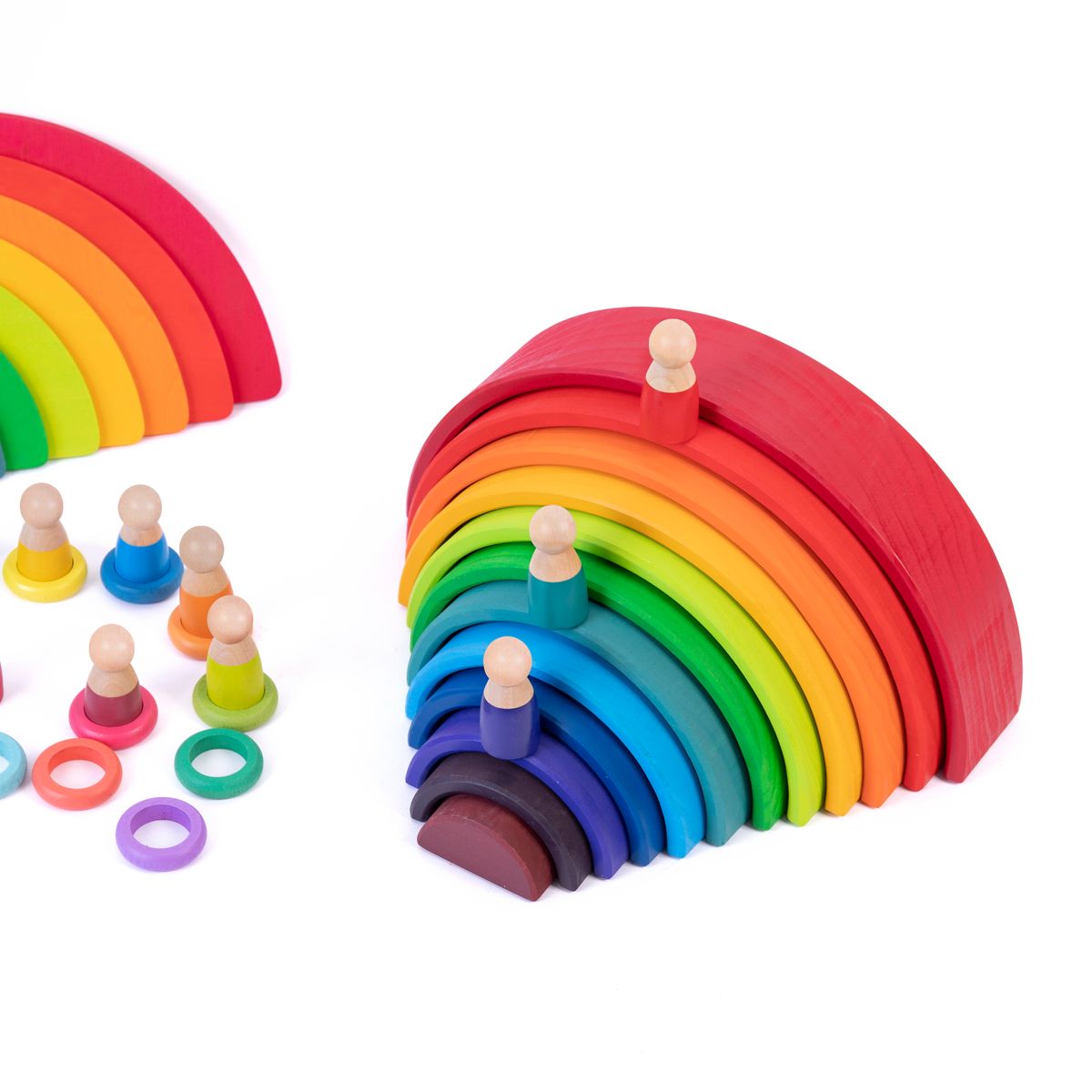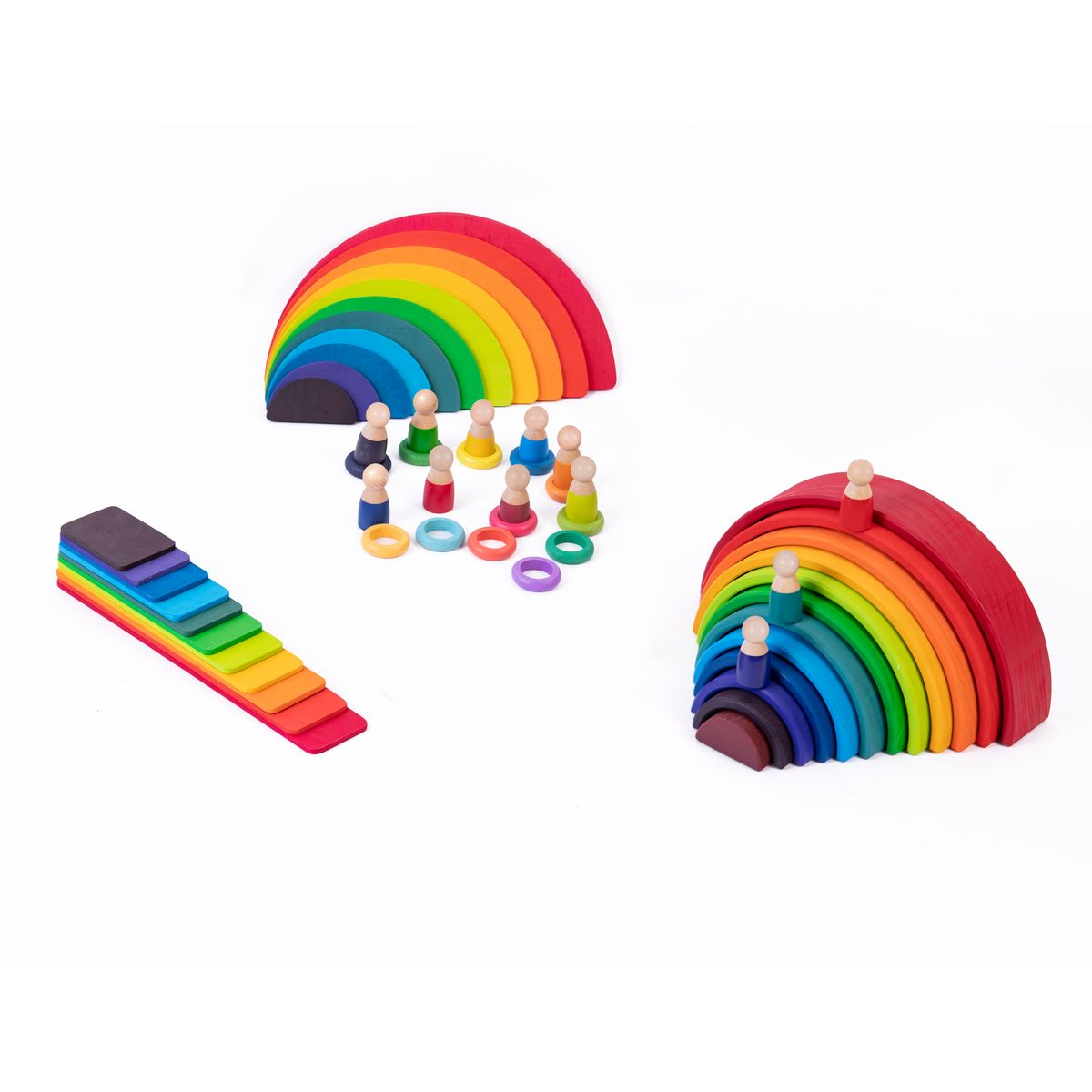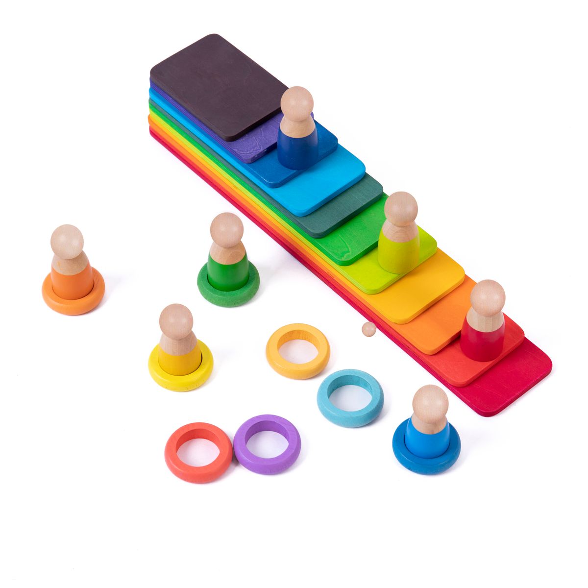 Questo set dà colore alla cameretta e offre molte possibilità di abbinamenti cromatici. Ad esempio, le figure possono essere collocate in anelli dello stesso colore, su gradini dello stesso colore o su piani dello stesso colore. I bambini imparano a costruire e ad assegnare con decisione i colori. Il materiale è adatto anche al gioco creativo e immaginativo. Con gli archi si può costruire un tunnel, un'altalena, una torre e molto altro. Possono anche essere perfettamente combinati con la scala lunga o rotonda. Si possono altresì costruire edifici di fantasia per farvi abitare le figure. Allo stesso tempo, i bambini imparano a indicare correttamente i colori e gli elementi. Un'attrazione per ogni stanza o casa dei bambini!