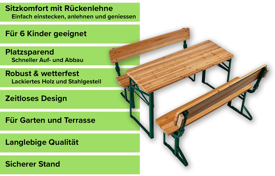 Da una festa di compleanno a un progetto didattico, il set di sedute per bambini è il complemento d'arredo ideale per soddisfare il loro bisogno di un ambiente preparato: adattato alle piccole dimensioni, il set offre una struttura chiara, una superficie in legno piacevole e liscia e spazio sufficiente per il lavoro di gruppo. Stimola i sensi, è pieghevole e può essere riposta in poco spazio, oltre ad essere estremamente robusta e durevole Il set di sedute crea uno spazio dove i bambini possono stare tra loro e agire in autonomia. Viene ripresa l'idea di “tavolino dei bambini”, in passato appositamente allestito per loro. I bambini amano avere un tavolo tutto per il loro gruppo, dove possono stare da soli e indisturbati.